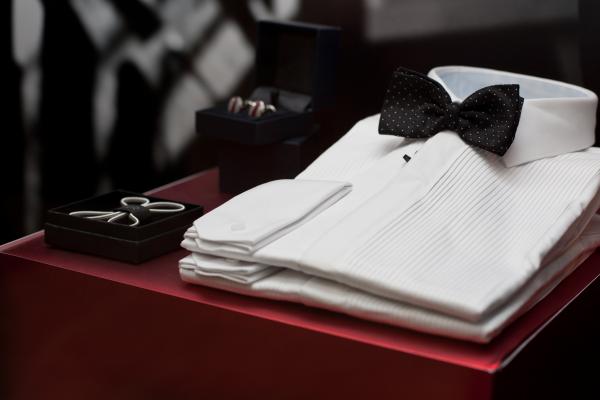 A white linen handkerchief should always grace a black-tie pocket, folded according to your preference. Some men prefer to slip the pocket square in and let it take its own shape, thereby adding an attractive irregularity to an otherwise uniform outfit.