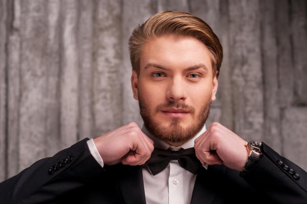 A fixed-length tie of an appropriate length is far better than a clip-on, pre-tied or adjustable model. Keep the tie proportional to your face by ensuring the ends of the bow fall between the edge of your face and the outer corners of your eyes.