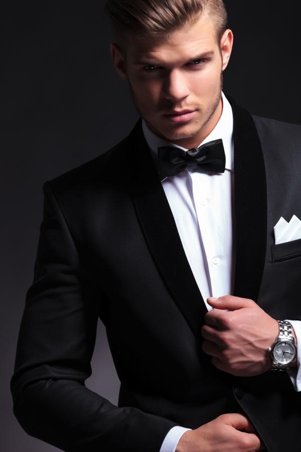 The black suit has a low button position to give a deep V and show plenty of the tuxedo shirt with the french cuffs and black buttons. The pockets are straight and have a satin trim but are not satin covered. The look is finished off with the black silk bow-tie.