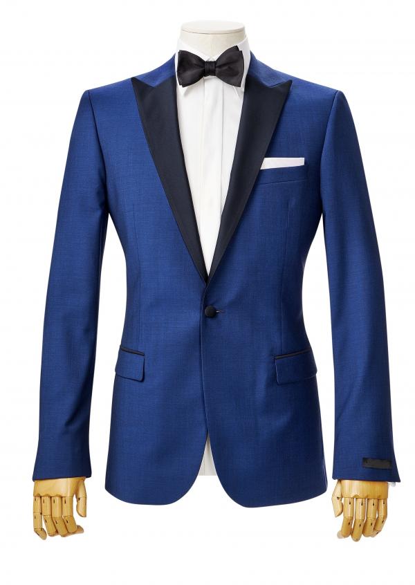 The dinner suit or dinner jacket (a.k.a. tuxedo) is typically black or midnight blue and is traditionally worn with a formal white shirt, polished shoes, and other accessories.